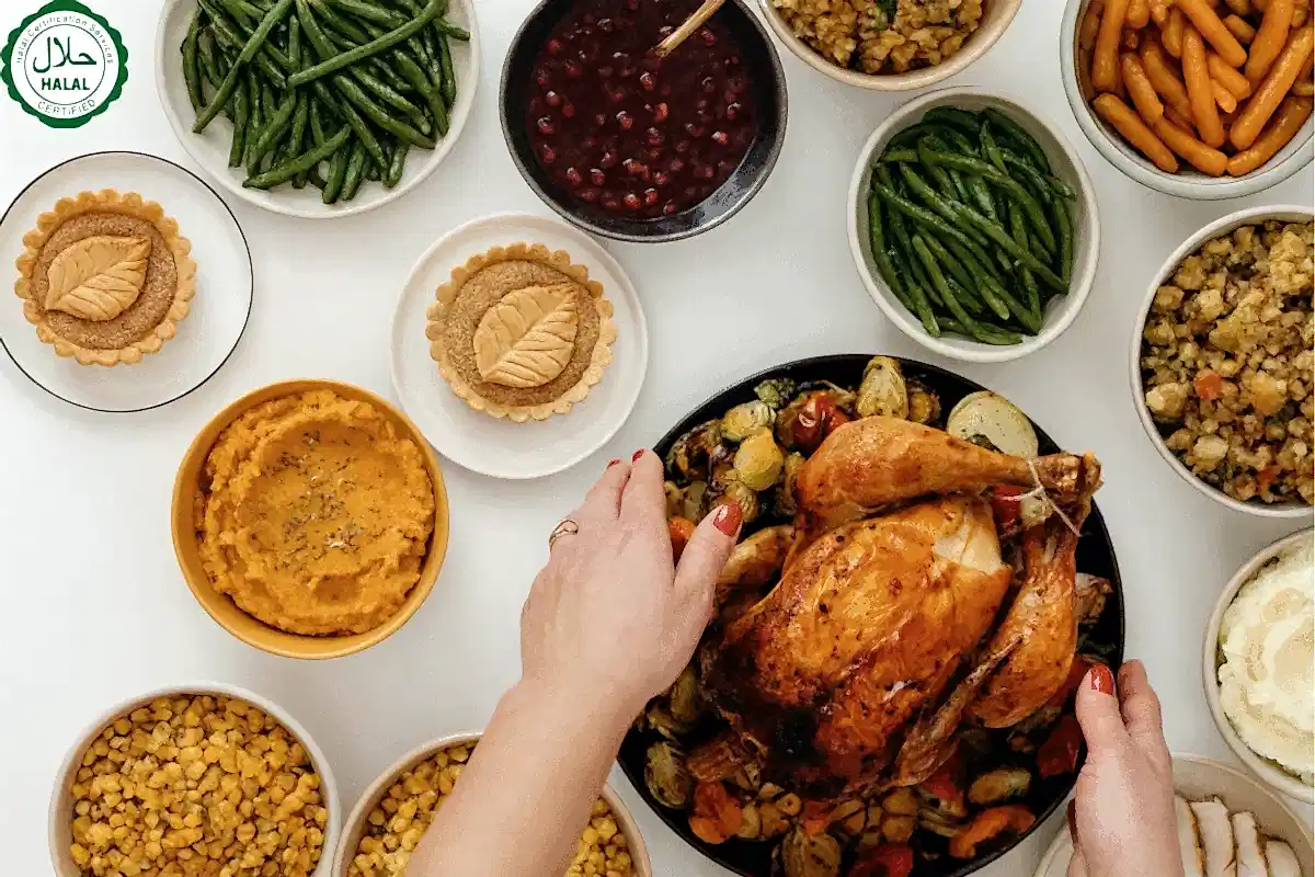 Turkey, Mashed Potatoes, Herb Bread Stuffing, Gravy, Corn, Cranberry, Green Beans.